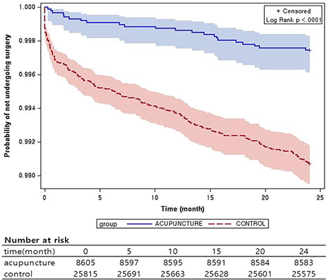 비침 치료군에 비해 무릎 수술률이 유의하게 낮음을 보이는 논문
