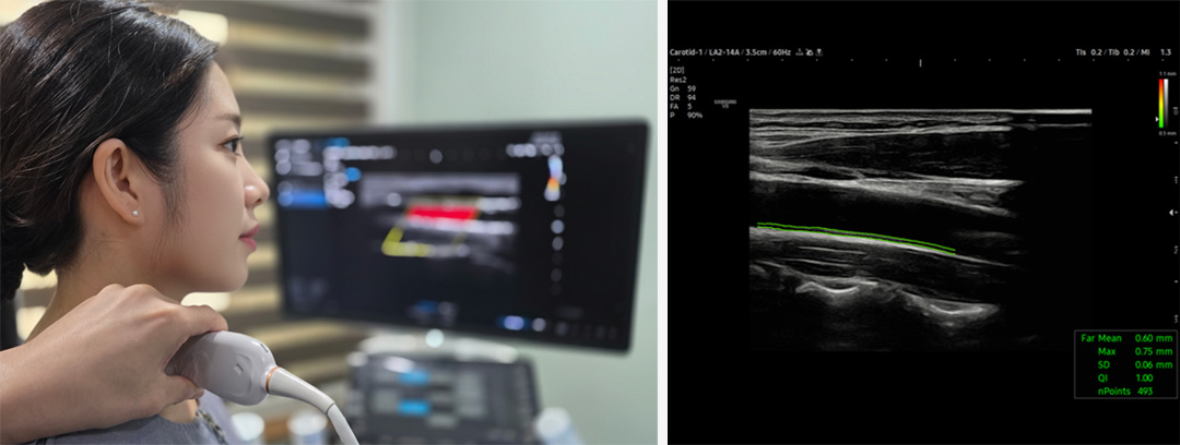 뇌로 혈액을 공급하는 주요 혈관인 경동맥의 두께, 혈류 속도, 협착 여부를 초음파로 확인하여 뇌혈류 문제나 동맥경화가 이명·난청에 영향을 주는지 진단합니다.