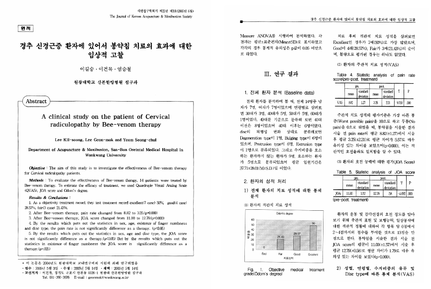출처 | 경추 신경근증 환자에 있어서 봉약침 치료의 효과에 대한 임상적 고찰